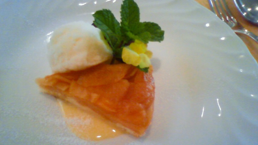 スポンジケーキにリンゴのスライス&カラメル掛けのパインシャーベット添え。