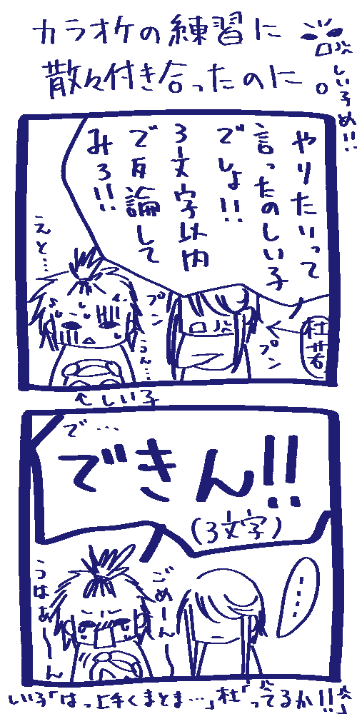 次のカラオケでリベンジするなら凌も参加するか、しい子のパートが凌に取って代わられるか・・・。